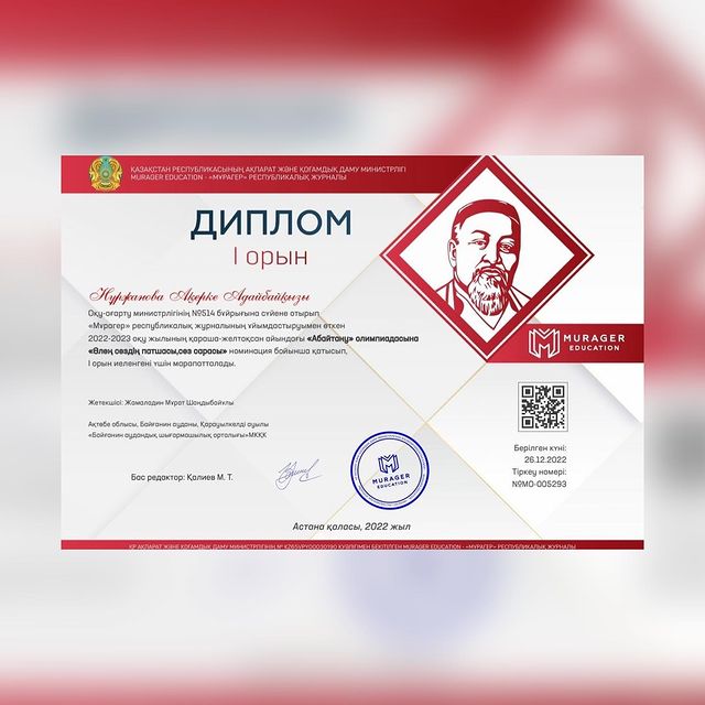 Ақтөбе облыстық ғылыми-тәжірибелік орталығының ұйымдастыруымен балалар жазушысы С.Я. Маршактың 135 жылдығына орай өткен "Пусть добрым будет ум у вас, а сердце умным будет" атты облыстық байқауында "Читаем строчки Маршака" номинациясы бойынша